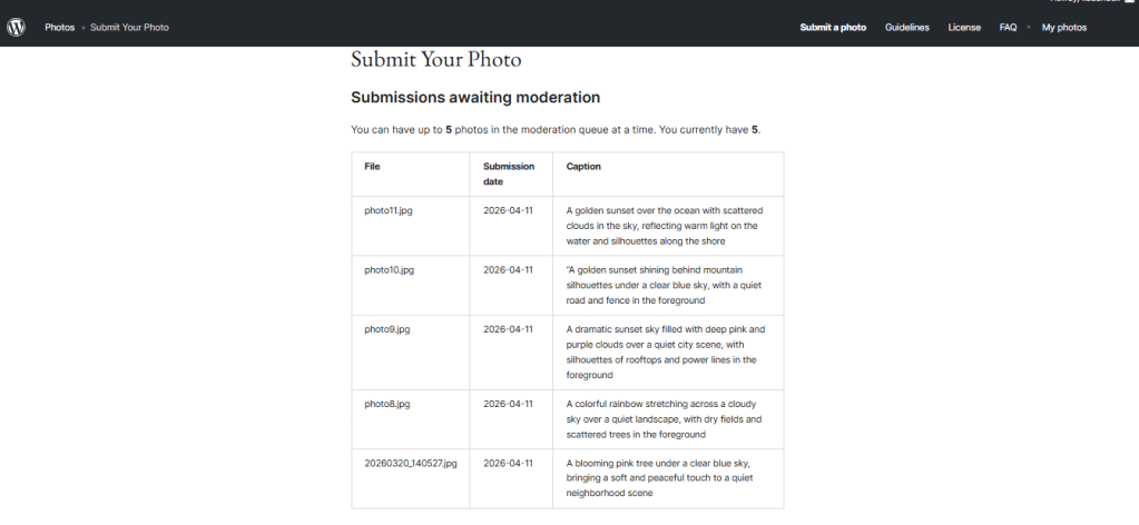Exitosamente las 5 primeras fotografías que subí fueron aprobadas. En está sección subí otras 5 fotografías con el detalle de que cada una tiene una breve descripción