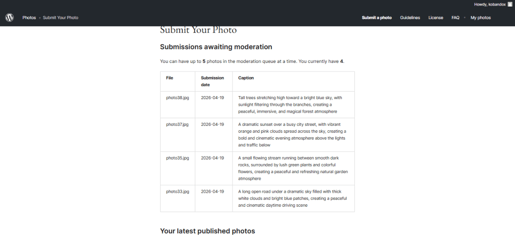 A este punto del proceso de contribución en wordpress, tengo aprobadas 26 fotografías. He subido las ultimas 4 fotografías a la espera de aprobación para completar mi repositorio de fotos